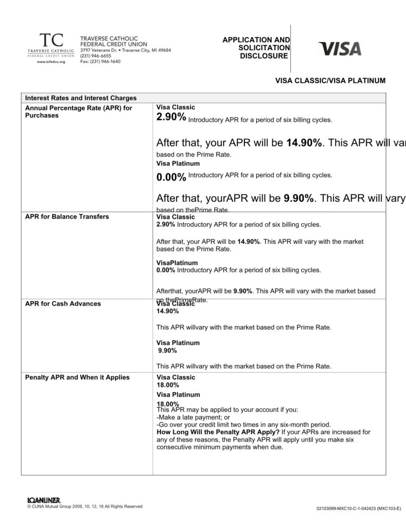 The Platinum VISA offers a 0% introductory APR on purchases for the first six billing cycles. The Classic VISA is a 2.9% APR on purchase for the first six billing cycles. After the introductory time, interest rates are as low as 9.90% APR, with no annual fee, and low monthly payments.